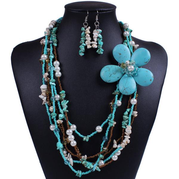 Exaggerated retro bohemian flower necklace turquoise Earrings Set Images |